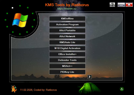 Ratiborus KMS Tools Lite is a collection of activators from Ratiborus in a single shell for Windows XP, Vista, 7, 8, 8.1, 10, 11, Server 2008, 2008 R2, 2012, 2012 R2, and Office 2010/2013/2016. Just choose the one you need and you're ready to use it right away. No installation required, everything is completely portable. Each program comes with a des*****ion in Russian. If you have questions about a program or aren't sure what it's for, click the question mark on the right to see icons next to the software names.
